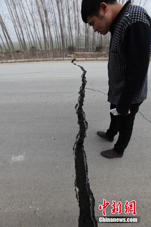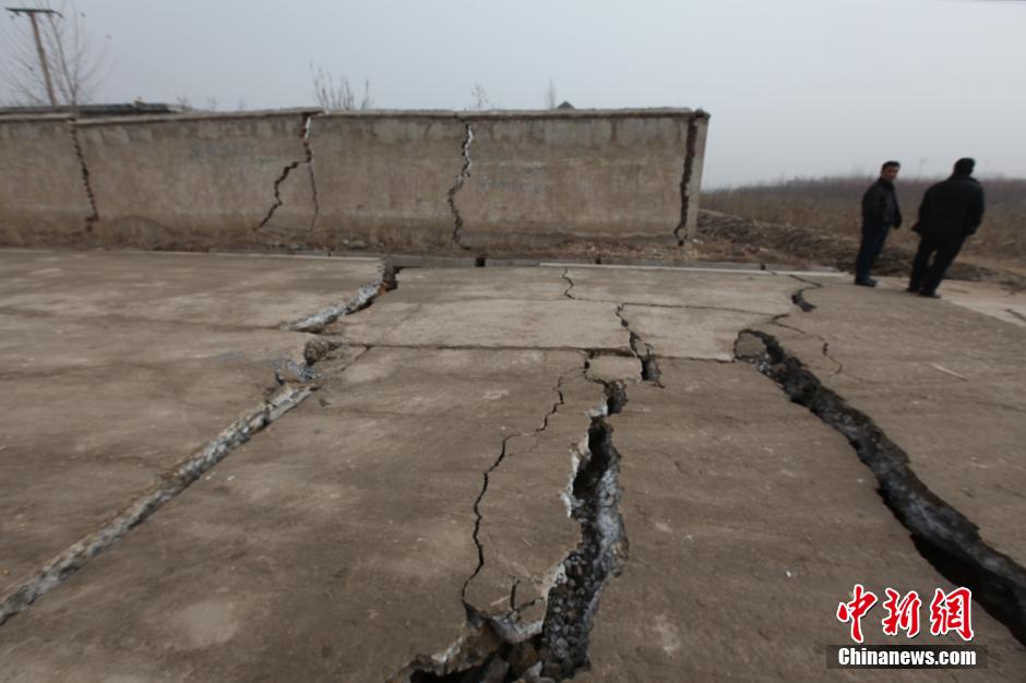 12月25日,山東平邑,位于平邑縣保太鎮(zhèn)的玉榮商貿(mào)有限公司石膏礦發(fā)生坍塌事故。圖為因塌陷開裂的道路。視覺中國供圖