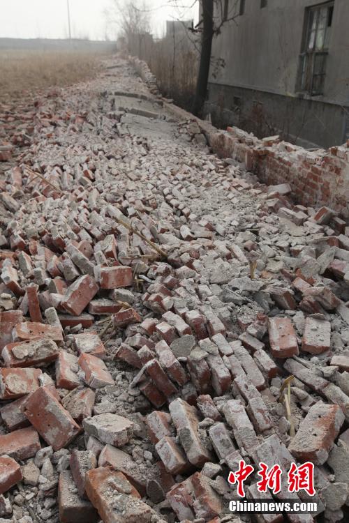 12月25日,山東平邑,位于平邑縣保太鎮(zhèn)的玉榮商貿(mào)有限公司石膏礦發(fā)生坍塌事故。圖為倒塌的院墻。視覺中國供圖