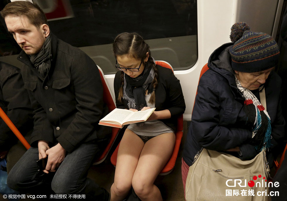 當?shù)貢r間2016年1月10日,奧地利維也納,“地鐵無褲日”當天,乘客穿短褲乘車。圖片來源:視覺中國