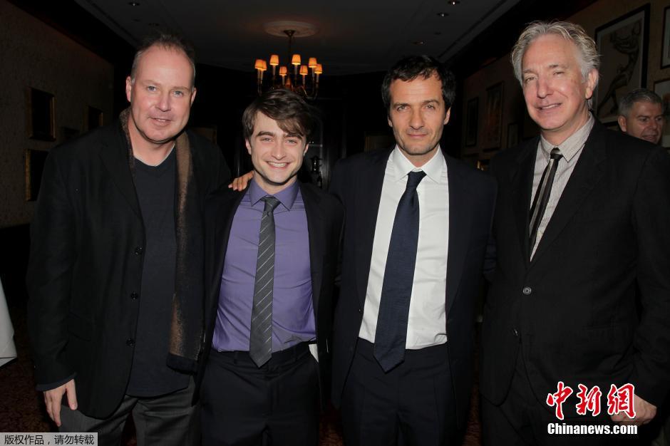 圖為2011年11月21日,電影《哈利·波特與死亡圣器2》導演大衛(wèi)·耶茨(David Yates,左)、男主角丹尼爾·雷德克里夫(Daniel Radcliffe)等人與阿倫·瑞克曼(Alan Rickman,右)在紐約合影。