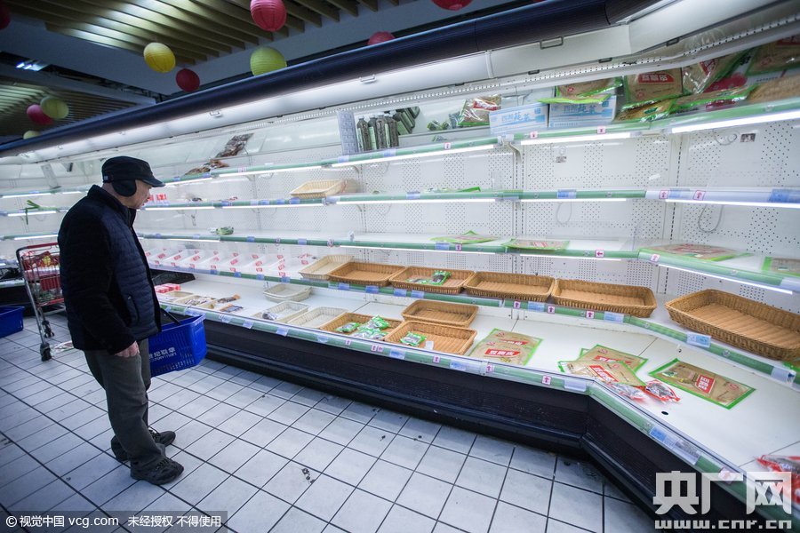 2016年1月20日,浙江省杭州市,杭州市氣象臺(tái)發(fā)布暴雪黃色預(yù)警信號(hào)。寒潮將至,市民紛紛囤積食品,眾多貨架被一搶而空。
