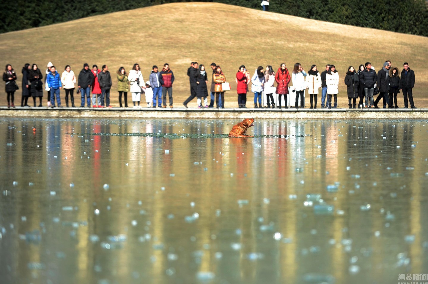 “狗狗主人一直告訴它要用力?!表?xiàng)先生說(shuō)大金毛雖然奮力掙扎,卻無(wú)濟(jì)于事,越掙扎陷得越深,體力也消耗了不少。一旁的狗主人很是著急,決定下水救它,無(wú)奈女同志體力有限,基本破不了冰。不忍看著一個(gè)生命就這樣消失。圖為眾人圍觀被困冰窟的金毛。
