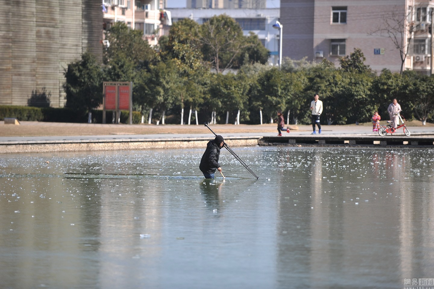項(xiàng)先生當(dāng)即放下手中的活,拿起拍攝使用的三腳架,直接走進(jìn)冰冷的湖水,敲碎河面上的冰,朝狗狗走去。最后金毛犬獲救。圖為項(xiàng)先生用三腳架破冰下水救金毛。