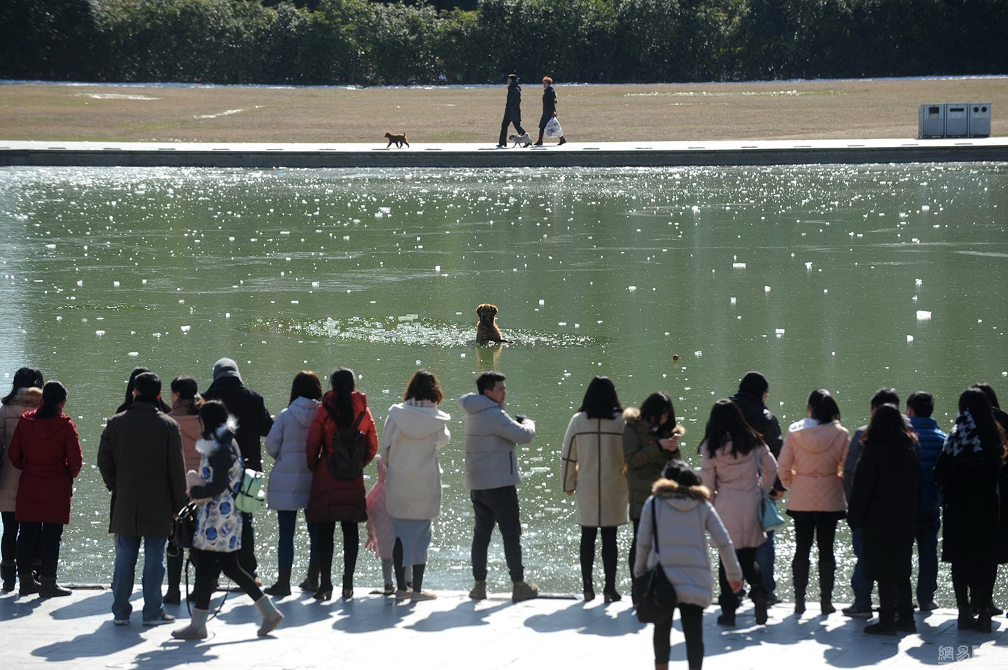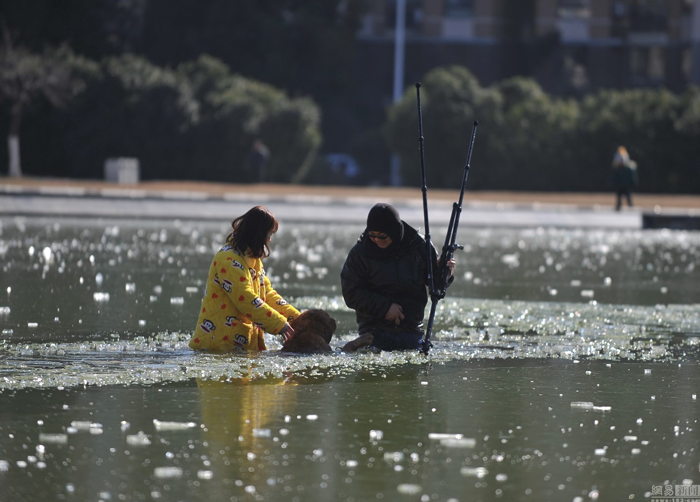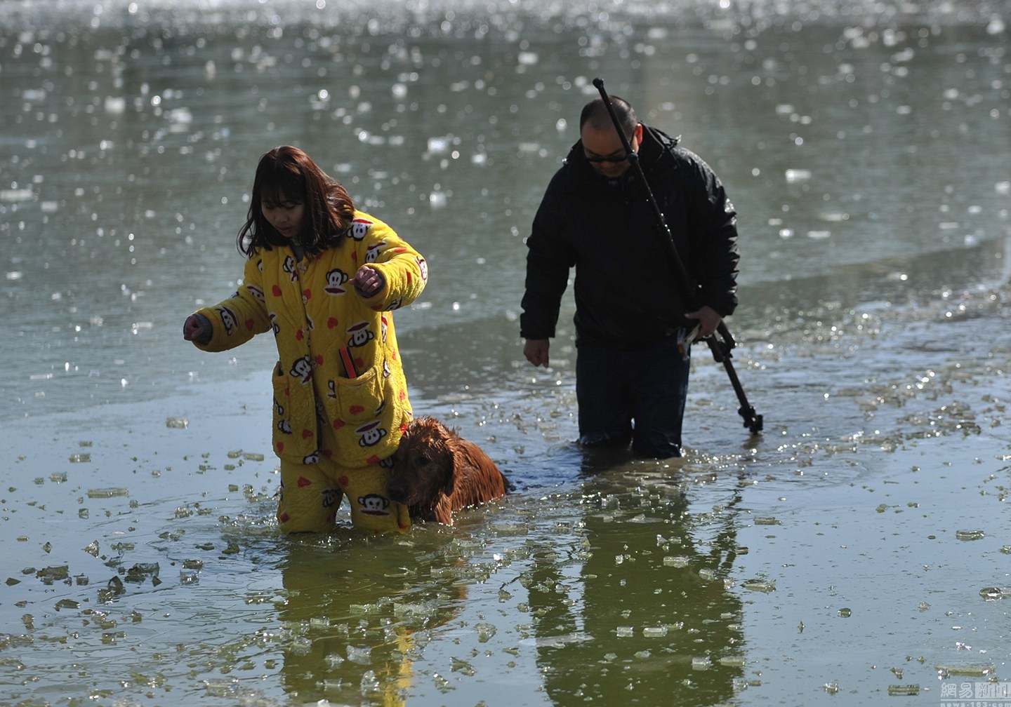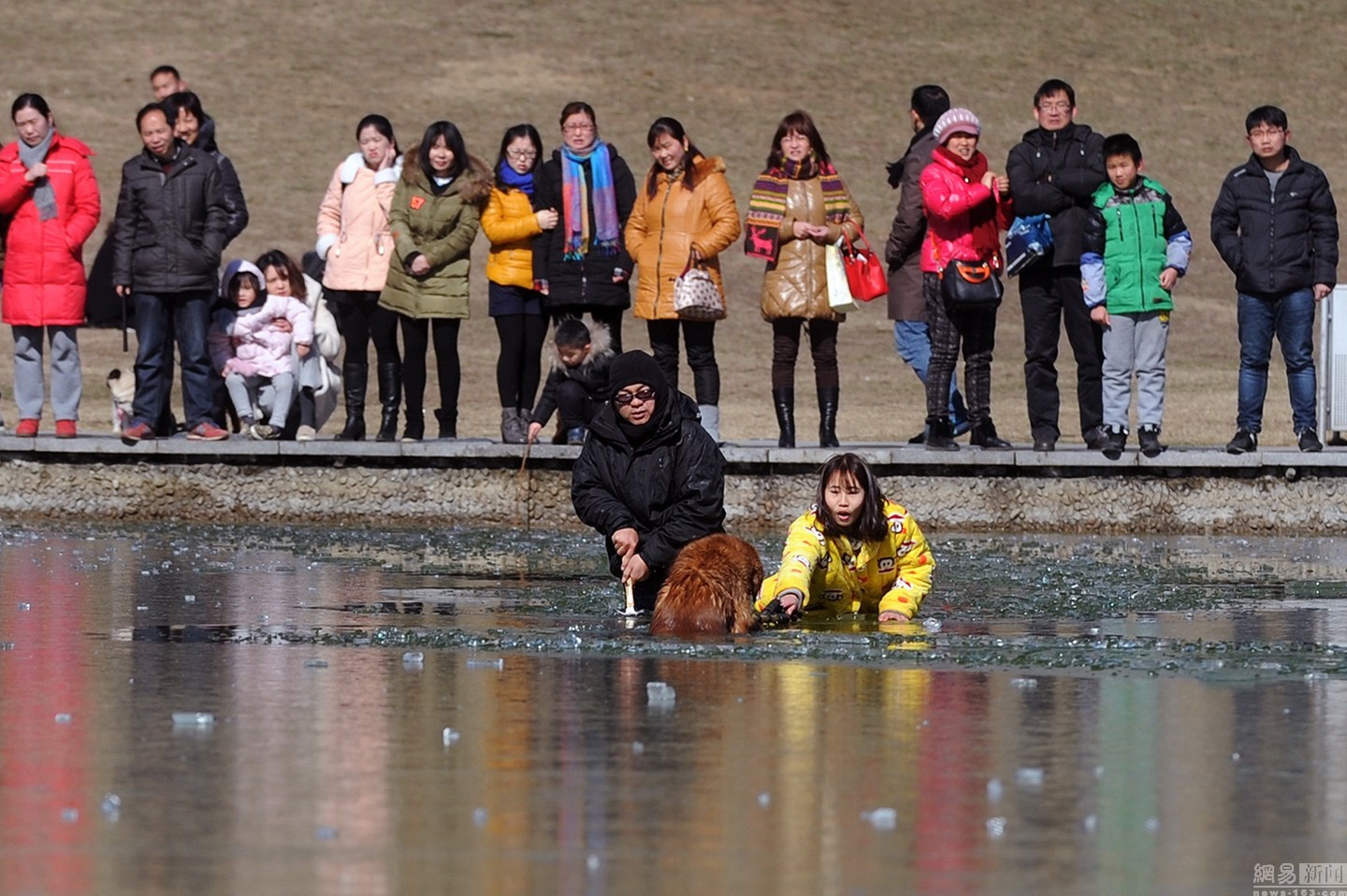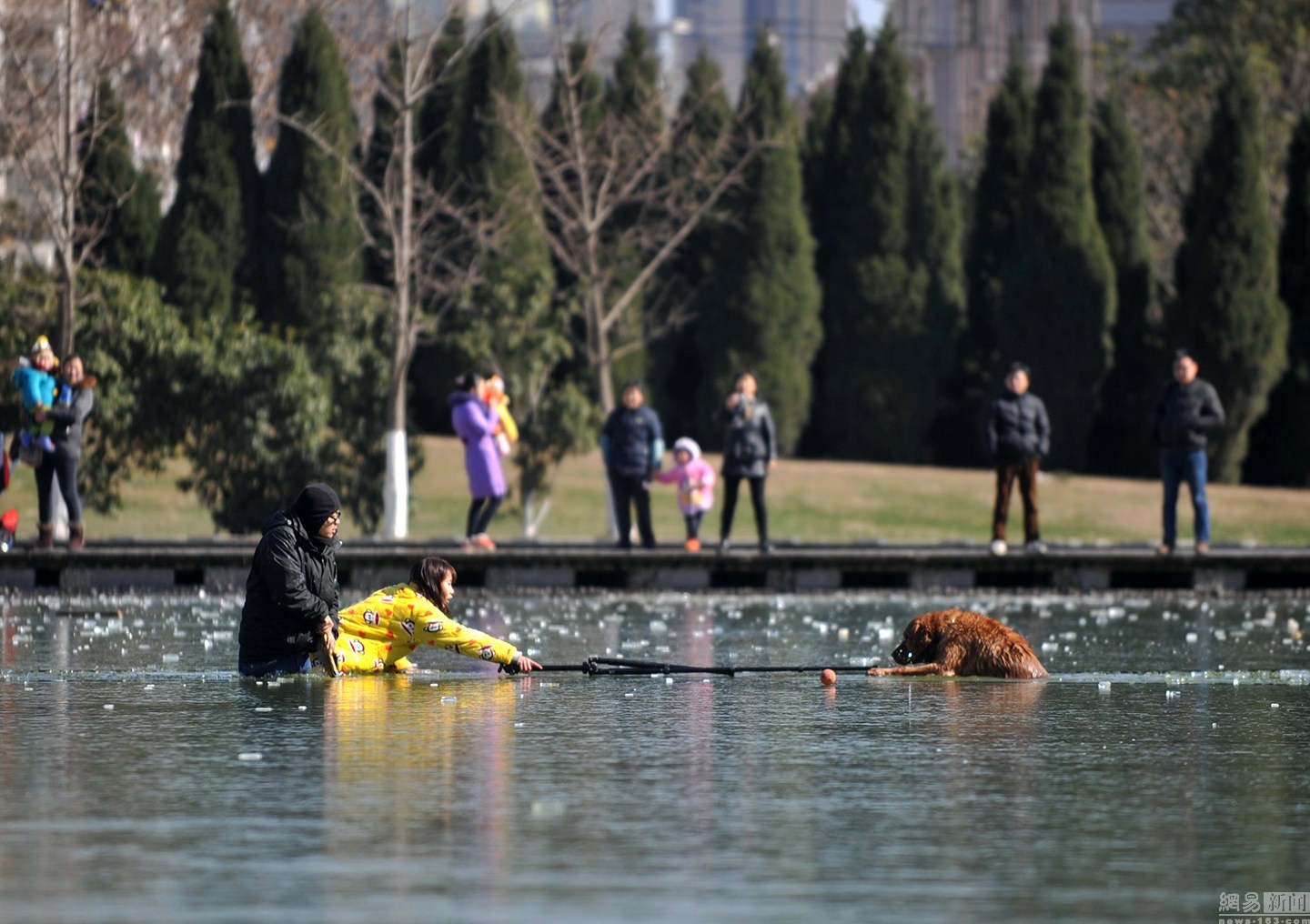 “我知道這水不深,自己又會(huì)游泳?!泵鎸?duì)冰冷的水面,項(xiàng)先生并沒(méi)有多想,只想趕緊救出狗狗。圖為兩人合力救金毛現(xiàn)場(chǎng)。