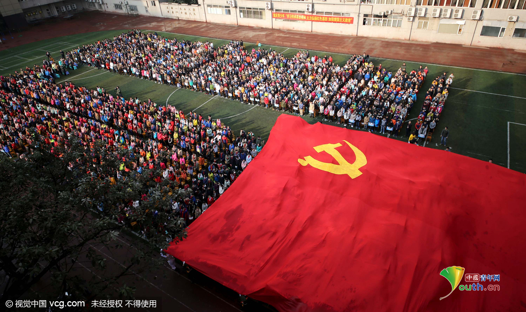 2016年02月24日,重慶市新區(qū),渝高中學(xué),開(kāi)學(xué)典禮上同學(xué)們傳遞一面90米寬的巨大黨旗。開(kāi)學(xué)第一課由聶榮臻元帥陳列館報(bào)告團(tuán)成員為同學(xué)們宣講老一輩無(wú)產(chǎn)階級(jí)革命家的豐功偉績(jī)。視覺(jué)中國(guó)