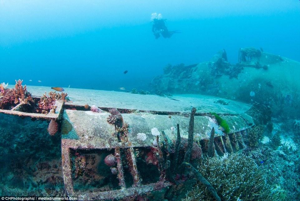 這些曾經(jīng)參與世界大戰(zhàn)的戰(zhàn)斗機(jī)如今安靜的躺在所羅門群島大海185英尺(約56米)的淺層海床上。今夕形成了鮮明的對比,英勇的美國F6F地獄貓戰(zhàn)斗機(jī)上覆蓋了大量的珊瑚。