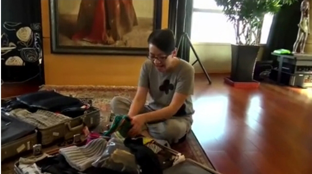 宋丹丹坐在地板上收拾衣物。