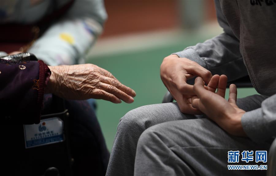 3月17日,奶奶與黃舸扮演者王峰見面后,伸出手準(zhǔn)備觸碰王峰的手,而王峰則保持著模仿肌營(yíng)養(yǎng)不良患者的手型。新華社記者 李尕 攝 圖片來源:新華網(wǎng)