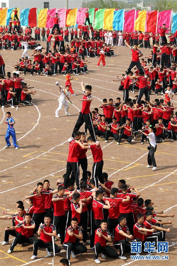 4月7日,在河南登封少林塔溝武術(shù)學(xué)校練功場,上課間操的學(xué)員進(jìn)行隊(duì)形變換。當(dāng)日,河南登封少林塔溝武術(shù)學(xué)校2016年“春訓(xùn)”拉開帷幕,2.6萬名學(xué)員同上陣,進(jìn)行隊(duì)形變換、十八般兵器、少林硬氣功、少林集體棍等多種功法演練。“春訓(xùn)”是少林塔溝武術(shù)學(xué)校每年春季開展的一項(xiàng)強(qiáng)化訓(xùn)練活動(dòng),旨在提升學(xué)員的耐力和競技狀態(tài)。新華社發(fā)(牛書培 攝)