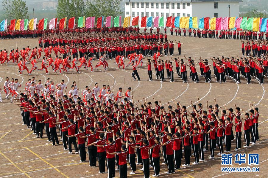 4月7日,在河南登封少林塔溝武術(shù)學(xué)校練功場,上課間操的學(xué)員擺出圓形圖案。當(dāng)日,河南登封少林塔溝武術(shù)學(xué)校2016年“春訓(xùn)”拉開帷幕,2.6萬名學(xué)員同上陣,進(jìn)行隊(duì)形變換、十八般兵器、少林硬氣功、少林集體棍等多種功法演練。“春訓(xùn)”是少林塔溝武術(shù)學(xué)校每年春季開展的一項(xiàng)強(qiáng)化訓(xùn)練活動(dòng),旨在提升學(xué)員的耐力和競技狀態(tài)。新華社發(fā)(牛書培 攝)