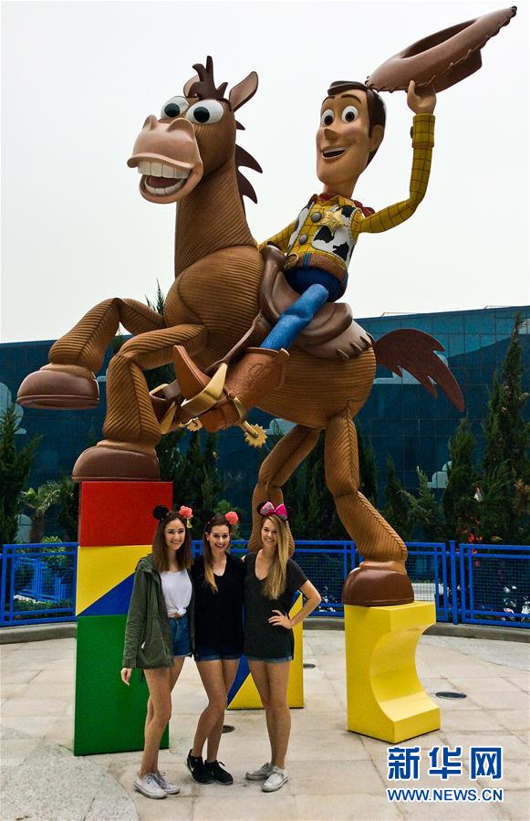 5月15日,參與內(nèi)部測試的游客在上海迪士尼玩具總動員酒店的廣場前留影。當(dāng)日,上海迪士尼主題酒店之——玩具總動員酒店大堂、廣場、餐廳、度假區(qū)短駁車等區(qū)域及設(shè)施開始內(nèi)部測試。這家共有800個(gè)房間的主題酒店將于6月中旬正式迎客。新華社發(fā)(鈕一新 攝)