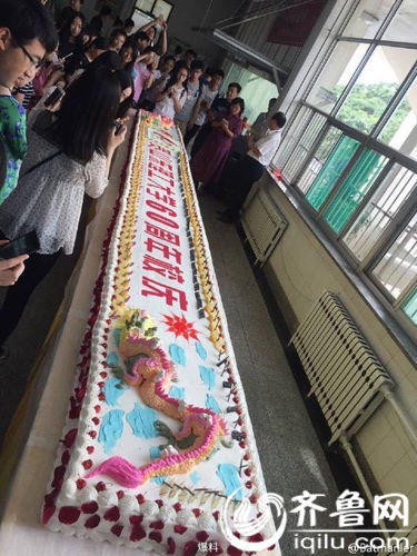 記者從網(wǎng)友發(fā)布的圖片中看到,在山東理工大學(xué)的某個(gè)食堂內(nèi),六米長的水果蛋糕被學(xué)生圍城了一個(gè)圈,而在該食堂的陽臺(tái)上站著一位老師,場面也十分歡樂。