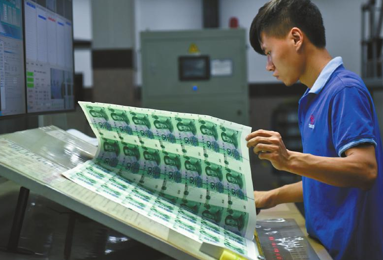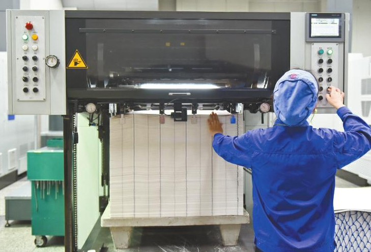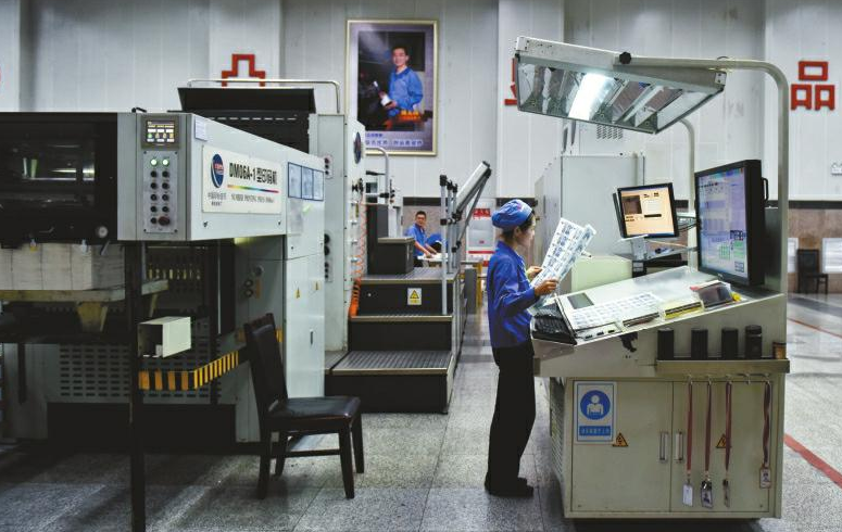 成鈔公司大門口,緊握槍支的武警駐守,在這里,有著嚴(yán)密的安檢措施。在經(jīng)過(guò)層層申報(bào)審批,暫存隨身攜帶的手包和手機(jī)后,記者獲批進(jìn)入生產(chǎn)車間。瞬間,靜謐被機(jī)器的轟鳴代替。在車間內(nèi),穿著藍(lán)色工裝的工人正有序忙碌著。在這里經(jīng)過(guò)多道印鈔工序及干燥、檢驗(yàn)等環(huán)節(jié)后,一張張雪白的印鈔紙“搖身一變”,成為紅紅綠綠的鈔票,整個(gè)過(guò)程前后需要耗時(shí)1個(gè)月左右。