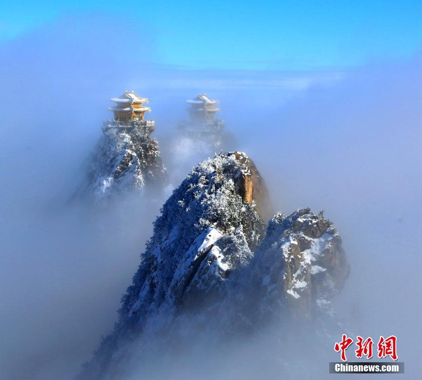 1月7日,連續(xù)降雪之后,位于河南洛陽(yáng)的道教圣地老君山雪后初晴,海拔2000米的伏牛山主峰上,白雪皚皚、銀裝素裹,加之云海浮現(xiàn)與藍(lán)天白云交相輝映,絕壁道觀似瓊樓玉宇幻如仙境美不勝收。圖為云海波濤洶涌,“淹沒(méi)”山頂。王中舉 攝