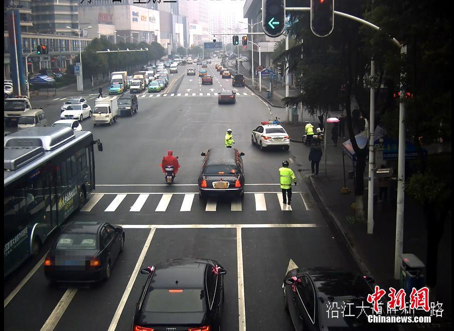 2月22日,湖北宜昌一位新郎在迎親時,迎親車隊的頭車因涉嫌套牌被交警查獲。在新郎家屬和交警溝通后,當(dāng)?shù)亟痪诵曰瘓?zhí)法,先“開道護送”,迎親結(jié)束后才扣下套牌車。圖為交警將套牌婚車成功攔截。石寧 攝