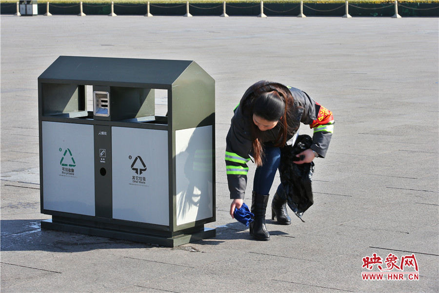 一位清潔員清理著垃圾箱,保持廣場(chǎng)上每一處的潔凈