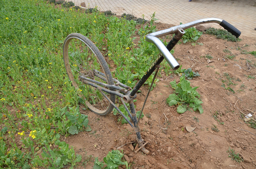 它現(xiàn)在的作用是鋤的角色,多少還有點兒犁的意思,但前身是一輛二八型的大自行車,仔細觀察了一下,這個輪子應(yīng)該是車子的后輪。