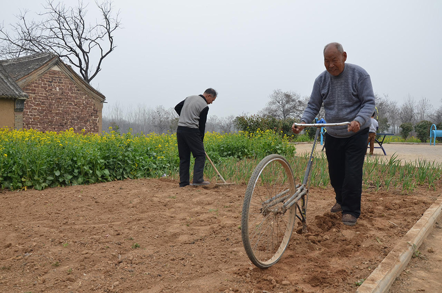 這種種菜的小地塊,推拖拉機過來翻有點兒擱不住,拿鋤頭鋤又有些費力,還好有這個神奇單車,連小孩子都能干活了。