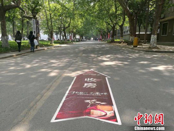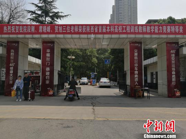 校園內(nèi)貼有收房指示路標。記者4月27日在西安建筑科技大學華清學院看到,華清學府城與該校緊鄰,中間有一道門可以進出。樓盤交房廣告標語張貼于學校大門的門柱上,寫有“交房臨時停車由此進入”、“46#樓交房現(xiàn)場由此前行”、“熱烈祝賀46#樓盛大交房”等標示。