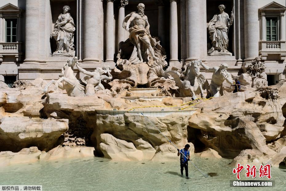 當?shù)貢r間2017年5月2日,意大利羅馬,一名工人在特萊維噴泉里收集硬幣。每年從噴泉里收集到的硬幣大約價值100萬歐元。
