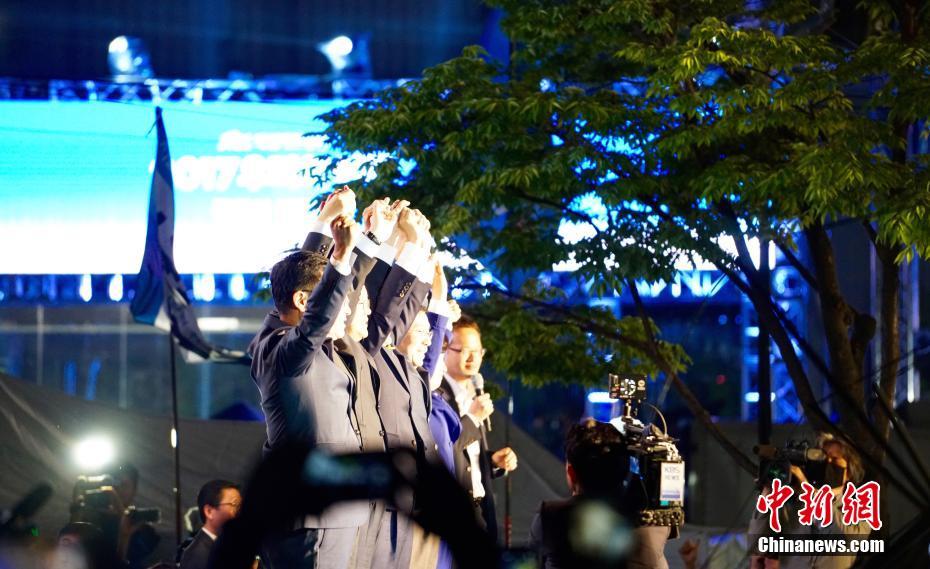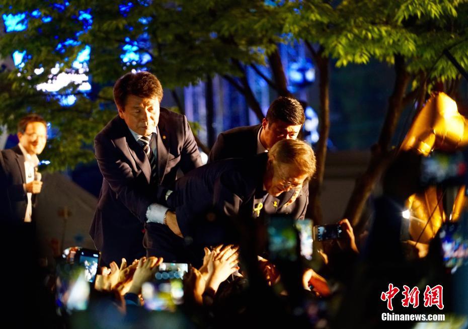 當(dāng)?shù)貢r(shí)間5月9日深夜,韓國(guó)第19屆總統(tǒng)選舉共同民主黨候選人文在寅及其競(jìng)選團(tuán)隊(duì)現(xiàn)身首爾光化門(mén)廣場(chǎng),發(fā)表“勝選演說(shuō)”,與支持民眾握手慶祝。據(jù)出口民調(diào)顯示,文在寅在當(dāng)日進(jìn)行的大選投票中以41.4%的支持率絕對(duì)優(yōu)勢(shì)勝選。在選舉管理委員會(huì)公布的大部分開(kāi)票結(jié)果中,文在寅得票率也遙遙領(lǐng)先,提前鎖定勝局。 中新社記者 吳旭 攝
