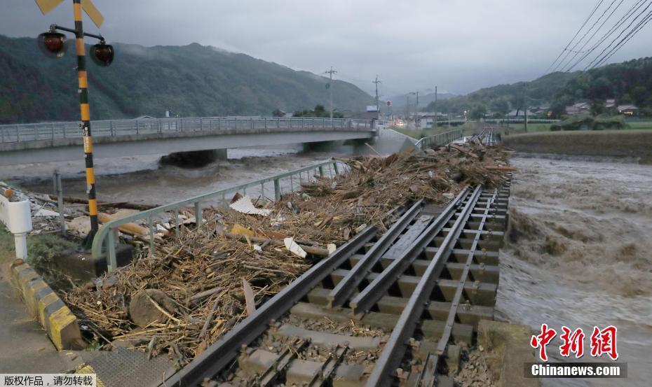 九州島福岡縣,洪水帶來的雜物堆滿鐵道,橋下洪流滾滾。