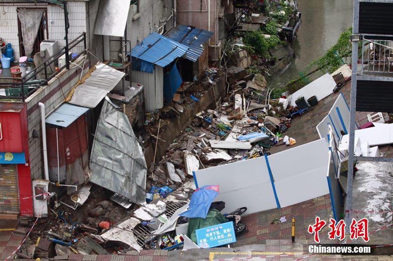 7月18日,深圳普降大暴雨局部特大暴雨,致部分路段嚴(yán)重積水、山體滑坡道路中斷、交通擁堵等險(xiǎn)情。深圳鹽田區(qū)盤山公路恩上路段出現(xiàn)滑坡,無人員、車輛被困;深鹽二通道下沙頭角出口匝道中間因山水傾瀉,道路中斷,交警已經(jīng)實(shí)施了交通管制。當(dāng)?shù)貧庀蟛块T先后發(fā)布了雷電、暴雨黃色、暴雨橙色和暴雨紅色分區(qū)預(yù)警信號(hào)。圖為深圳寶安區(qū)西鄉(xiāng)永安商業(yè)城門前區(qū)域坍塌,長(zhǎng)約15米、寬約6米的塌陷。中新社記者 鐘新 攝