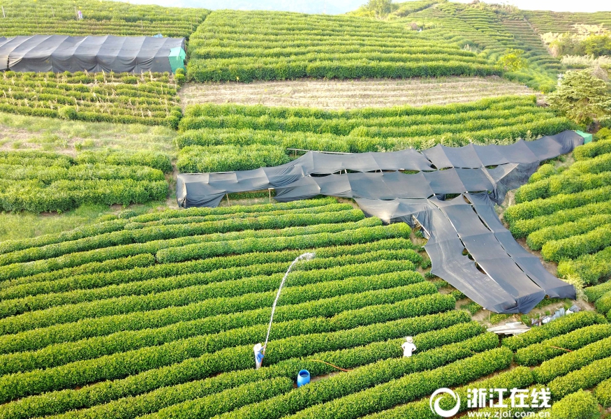 連日來(lái),杭城持續(xù)高溫?zé)o雨,西湖龍井茶一級(jí)保護(hù)區(qū)的梅家塢村、梵村、雙峰村等地茶樹(shù)“受傷”不輕。茶農(nóng)們積極行動(dòng)起來(lái),為茶樹(shù)蓋上防曬網(wǎng),同時(shí)采取澆水的方式抗旱保茶。(浙江在線記者 吳元峰 董旭明 攝)