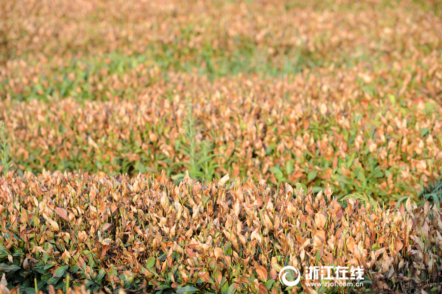 7月27日,熱浪滾滾,杭州西湖區(qū)梵村,龍井茶樹(shù)被太陽(yáng)烤成焦葉狀。