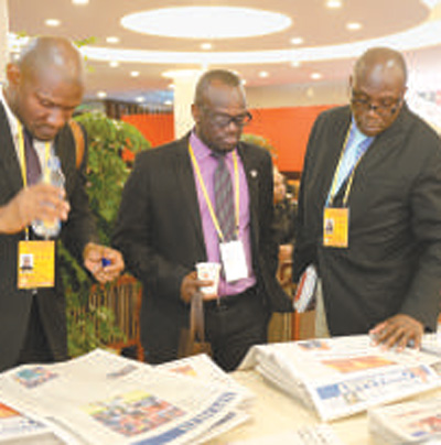 外國記者在十九大新聞中心翻閱報(bào)紙,了解十九大新聞。 人民視覺 |