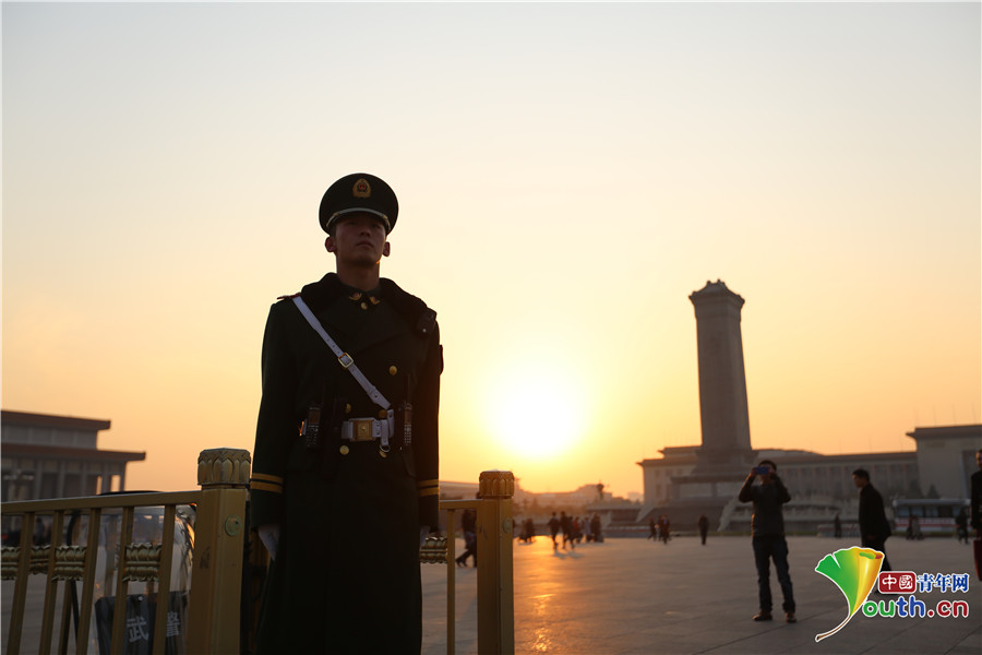 11月19日下午,武警官兵在天安門(mén)廣場(chǎng)執(zhí)勤。中國(guó)青年網(wǎng)通訊員 李超 攝