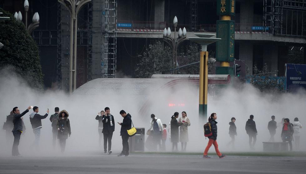 記者注意到,水霧來源于草叢中的多個隱形噴頭。這項讓天府廣場有些“仙味兒”的變化,正是成都推進大氣污染防治科技治霾的新動作——打開這個名為“超細清水霧系統(tǒng)”的除霾裝置,可以降解距離地面10米以內的漂浮揚塵顆粒物,起到除霾、降塵、降溫、增加空氣濕度、增加負氧離子的作用。