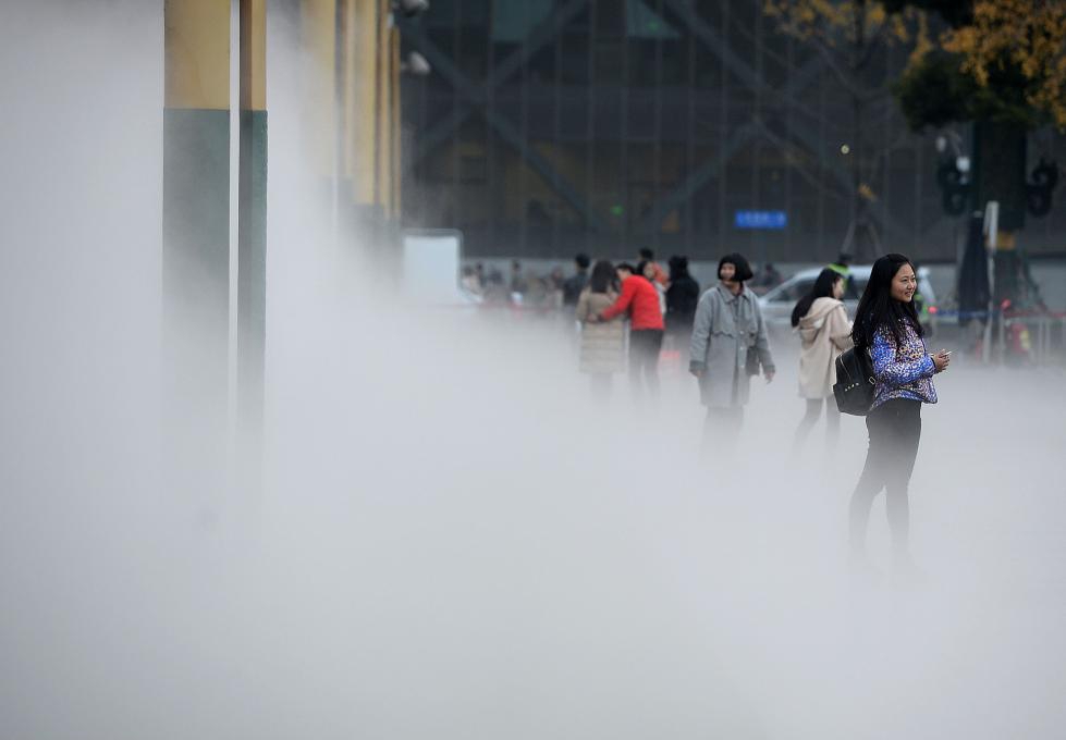 2017年12月23日,成都。天府廣場西側和南側有了新變化——上午10點,綠油油的草坪上空開始籠罩著層層白色霧氣,仿佛置身于仙境一般。走近一點,還有水霧襲來,平添一分清新和涼意。