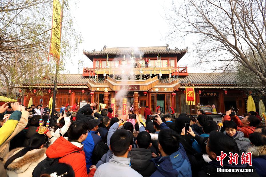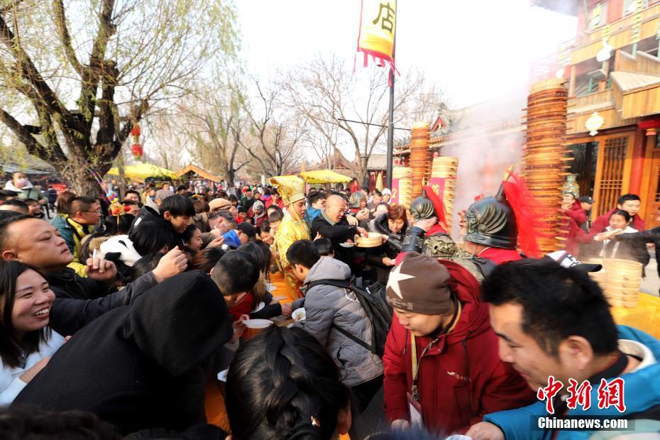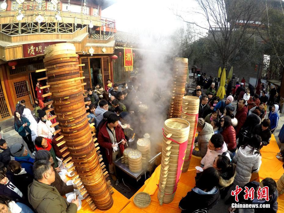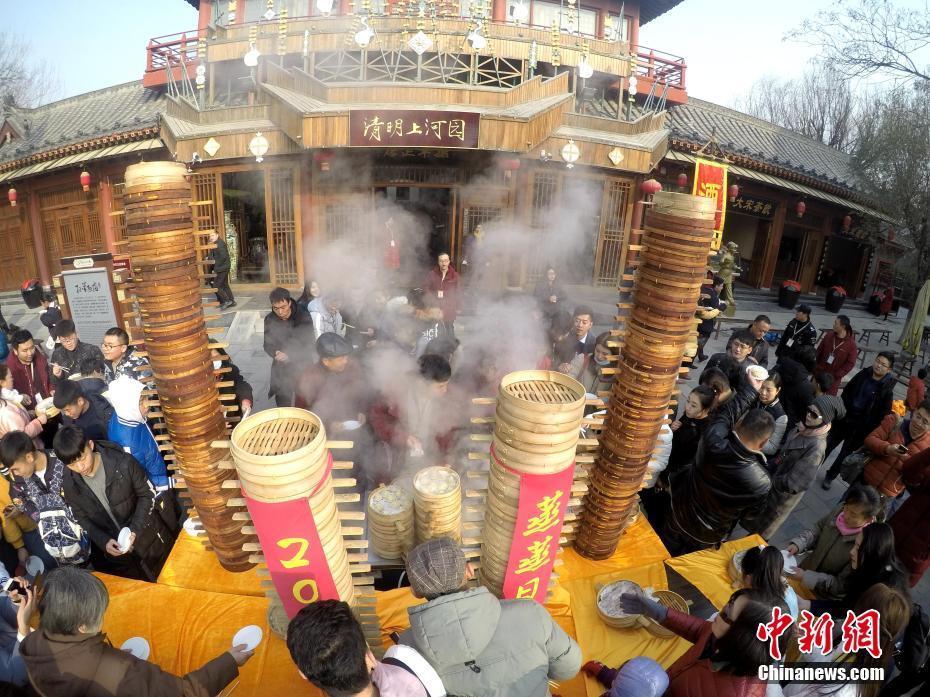 2018年1月1日,河南開封清明上河園孫羊正店門前,現(xiàn)場高高疊起的小籠包熱氣騰騰,小籠包上喜慶的紅字寫著“2018”“蒸蒸日上”。“宋徽宗”帶領(lǐng)“后宮佳麗”為游客免費(fèi)發(fā)放剛剛蒸好的小籠包,寓意新的一年“蒸蒸日上”,吸引數(shù)千名游客爭相品嘗求好運(yùn)。據(jù)清明上河園市場部石經(jīng)理介紹,為了給游客送上這份新年祝福,清明上河園啟用了多個(gè)地方一起蒸小籠包,當(dāng)天共準(zhǔn)備了2018籠開封名吃“灌湯包”,在多個(gè)發(fā)放點(diǎn)陸續(xù)為民眾送上新年的“免費(fèi)午餐”,祝愿大家都能夠在新的一年里“蒸蒸日上”。中新社記者 王中舉 攝