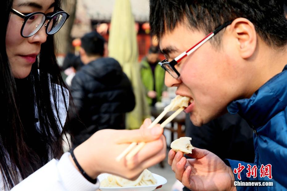 2018年1月1日,河南開封清明上河園孫羊正店門前,現(xiàn)場高高疊起的小籠包熱氣騰騰,小籠包上喜慶的紅字寫著“2018”“蒸蒸日上”?!八位兆凇睅ьI(lǐng)“后宮佳麗”為游客免費(fèi)發(fā)放剛剛蒸好的小籠包,寓意新的一年“蒸蒸日上”,吸引數(shù)千名游客爭相品嘗求好運(yùn)。據(jù)清明上河園市場部石經(jīng)理介紹,為了給游客送上這份新年祝福,清明上河園啟用了多個(gè)地方一起蒸小籠包,當(dāng)天共準(zhǔn)備了2018籠開封名吃“灌湯包”,在多個(gè)發(fā)放點(diǎn)陸續(xù)為民眾送上新年的“免費(fèi)午餐”,祝愿大家都能夠在新的一年里“蒸蒸日上”。中新社記者 王中舉 攝