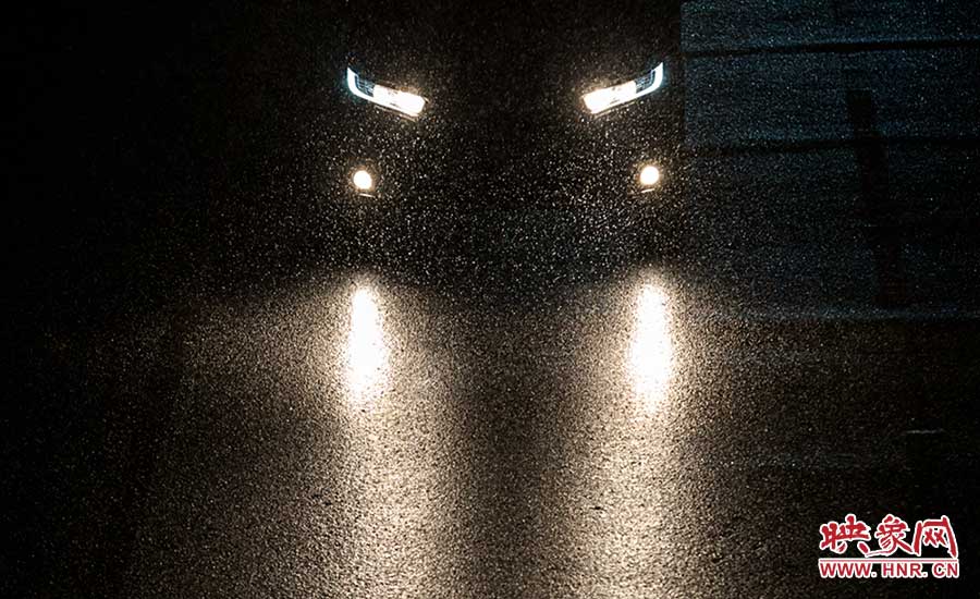 車燈前密集的雪花