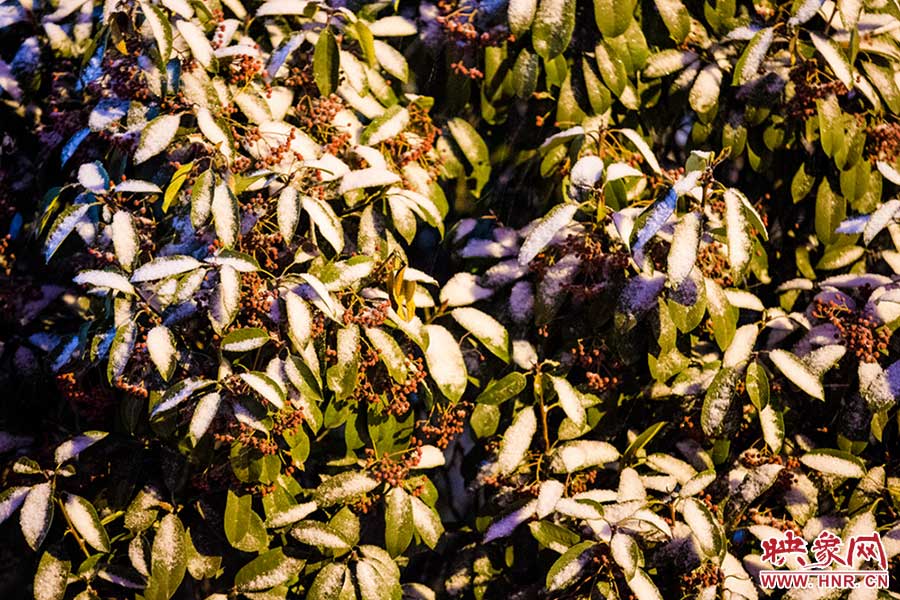 綠葉上也積了一層雪花