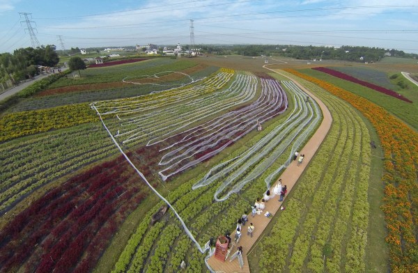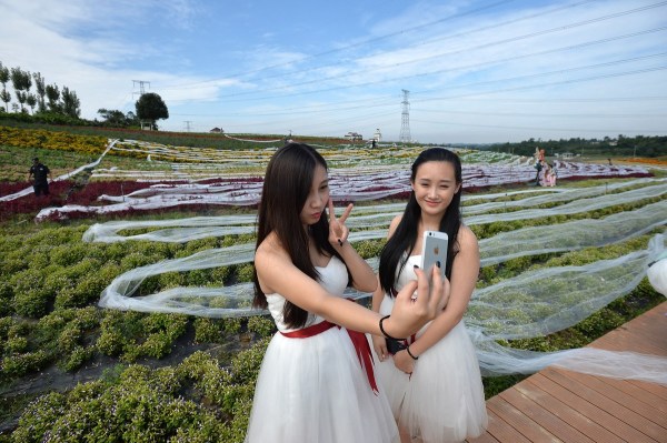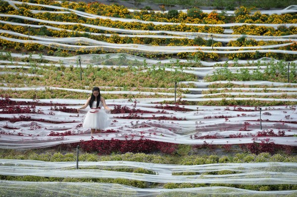 9月24日,成都一景點(diǎn)內(nèi)現(xiàn)4100米長的婚紗,該婚紗耗時(shí)一個(gè)月制成,大約花費(fèi)4萬元。成都商報(bào)/東方IC