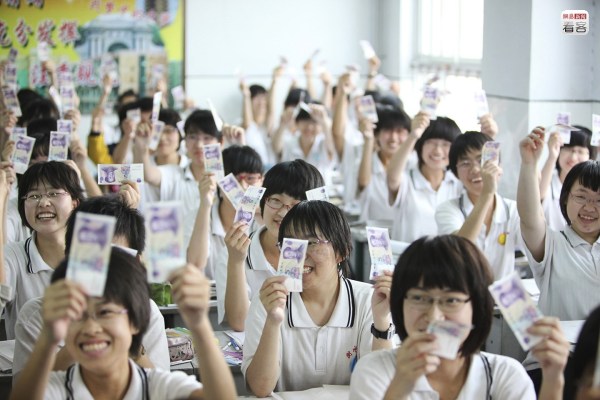 學(xué)校的另一項(xiàng)解壓措施是發(fā)放“回頭錢(qián)”,向每名學(xué)生發(fā)兩張五元紙幣,寓意“五谷豐登”、“十全十美”。圖為2012年6月3日,一位老師拿著一沓新紙幣準(zhǔn)備發(fā)給學(xué)生。