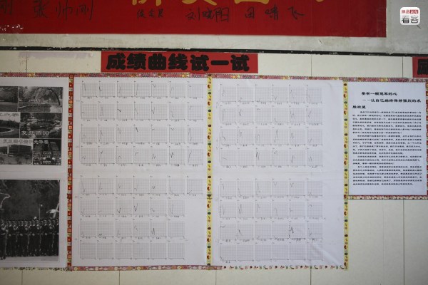 圖為2013年5月10日,學(xué)校走廊上貼著的“成績(jī)曲線”,將每個(gè)學(xué)生歷次考試成績(jī)以曲線的方式展現(xiàn)。而這樣類(lèi)似的成績(jī)表、成績(jī)單布滿了走廊的每一面墻。