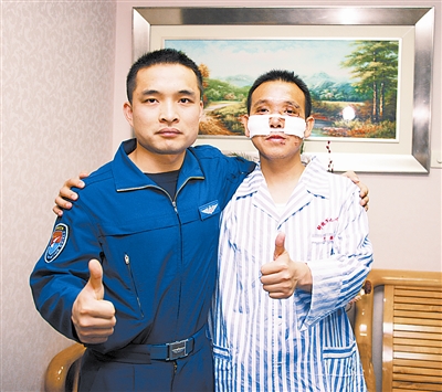 9時16分,飛機降落在跑道上,早已等候在停機坪上的官兵沖了上去。經(jīng)診斷,張建興面部裂傷7處,頭、面部大面積挫傷,傷口最長達6厘米,深達顴骨,并有骨質(zhì)暴露,面部需縫合30余針。