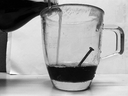 昨天中午12點(diǎn),記者針對(duì)微博上熱炒的“可樂(lè)去銹”事件,買來(lái)某品牌500毫升可樂(lè)一瓶,隨后將兩枚4厘米長(zhǎng)銹跡斑斑的鐵釘放入透明的6厘米高的玻璃杯子里,開(kāi)始做浸泡實(shí)驗(yàn)。