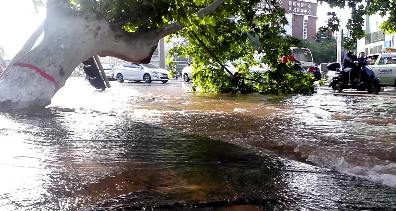 鄭州表情:鄭州水管爆裂 沖倒大樹線桿