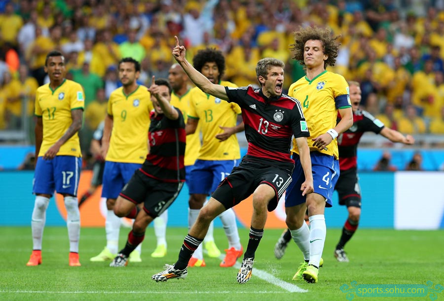 北京時(shí)間7月9日凌晨4時(shí),2014年巴西世界杯首場(chǎng)半決賽在貝洛奧里藏特的米內(nèi)郎體育場(chǎng)進(jìn)行,東道主巴西迎戰(zhàn)上屆季軍德國。最終,德國隊(duì)?wèi){借在18分鐘內(nèi)連入5球的攻擊狂潮以及下半場(chǎng)許爾勒替補(bǔ)登場(chǎng)后的梅開二度,7-1超大比分淘汰巴西,昂首晉級(jí)決賽。第10分鐘,穆勒利用角球機(jī)會(huì)首開紀(jì)錄。第22分鐘,克洛澤門前兩連擊攻入世界杯第16球,超越羅納爾多,成為世界杯進(jìn)球第一人。第24分鐘和第25分鐘,克羅斯1分鐘內(nèi)連入2球。第28分鐘,赫迪拉又接厄齊爾傳球打進(jìn)一球。第68分鐘,許爾勒又接拉姆助攻,門前包抄打門得手。第79分鐘,許爾勒禁區(qū)左側(cè)小角度攻入世界波。第90分鐘,奧斯卡才攻入挽回顏面的一球。
