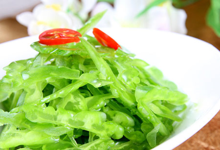 苦瓜可炒食、煮食或蒸食,清苦爽口,先苦后甜,口味長(zhǎng)久。如將苦瓜和辣椒同炒,可減輕苦味。將其切成薄片,然后在上面灑上一些鹽漬。一會(huì)兒,再用水把鹽濾掉;也可以把苦瓜切成塊,然后煮熟,放進(jìn)冷水中浸泡,這樣苦瓜的苦味就會(huì)減少許多。