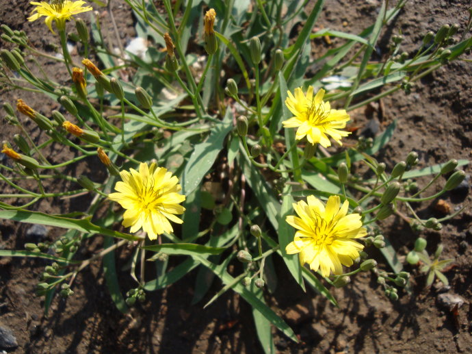 原生形態(tài):抱莖苦荬菜多年生草本,高可達(dá)1米許。根粗壯而垂直。莖直立。根生葉排成蓮座狀,葉片長(zhǎng)圓狀倒披針形,倒向羽裂狀或羽狀缺刻,先端短尖或鈍圓,基部慚狹成柄,花期通常不萎落;莖生葉基部抱莖。頭狀花序排成傘房狀;總苞圓摘狀,外層苞片極短小,內(nèi)層苞片線狀披針形;花黃色,全部為舌狀花,先端5齒裂;花柱細(xì)長(zhǎng),柱頭2裂,冠毛白色,一層。瘦果紡錘形,稍扁,果喙長(zhǎng)約為瘦果的1/4,通常與瘦果不同色?;ㄆ诖杭?。生于山腳、路邊、疏林內(nèi)、河邊。
