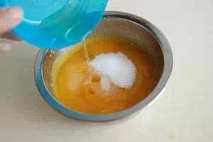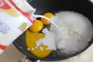 1、蛋黃、細砂糖、牛奶全部倒入小鍋中,并攪拌均勻。