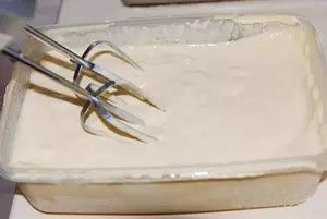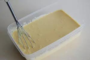 8、等冰淇淋剛開始結(jié)冰時取出容器,用打蛋器攪打一會兒,之后每隔30分鐘取出攪打一次,共打4次以上即可。