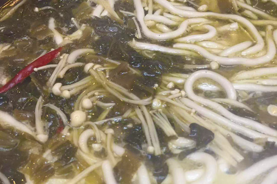 3.鍋中加入少許油,爆香蒜片、泡椒,加入料酒,隨后放入酸菜,超出酸菜的香味,然后加入開水,再放入金針菇和土豆粉,加入鹽、胡椒粉、料酒調(diào)味,中火慢慢煮,成熟撈出用來(lái)裝盆墊底。