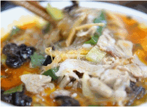 將羊肉和羊骨放入鍋中一起熬制成鮮香的羊湯,將大鍋里熬好的羊湯放入小鍋中,加入木耳粉絲黃花菜蔥花,煮的軟爛的羊肉切成片狀,放入鍋中一起熬制,再放一點羊油辣椒用筷子輕輕一攪,羊湯的香味混著辣椒的焦香,這香味讓人無法拒絕,相信這地道的登封燴羊肉一定能俘獲韓寒的胃。
